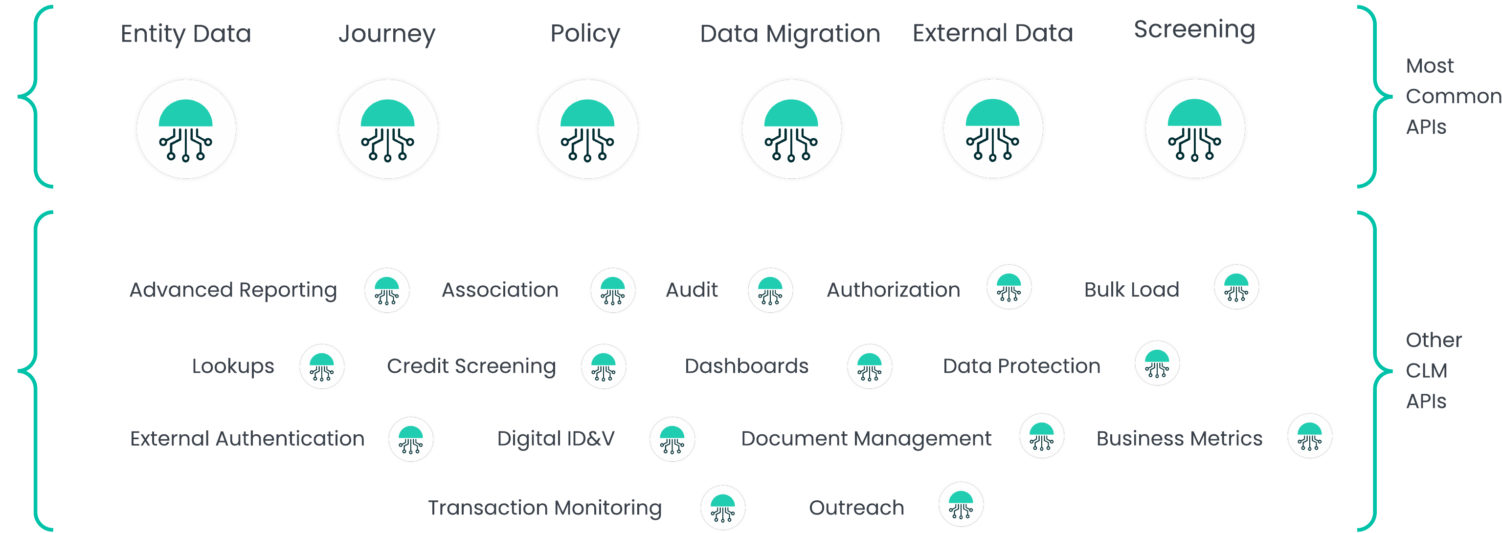 We have grouped the most commonly used APIs together as these tend to address the most common use cases that clients are looking to solve. Then in the next section called Other CLM APIs there are further domain specific links to the API documents.