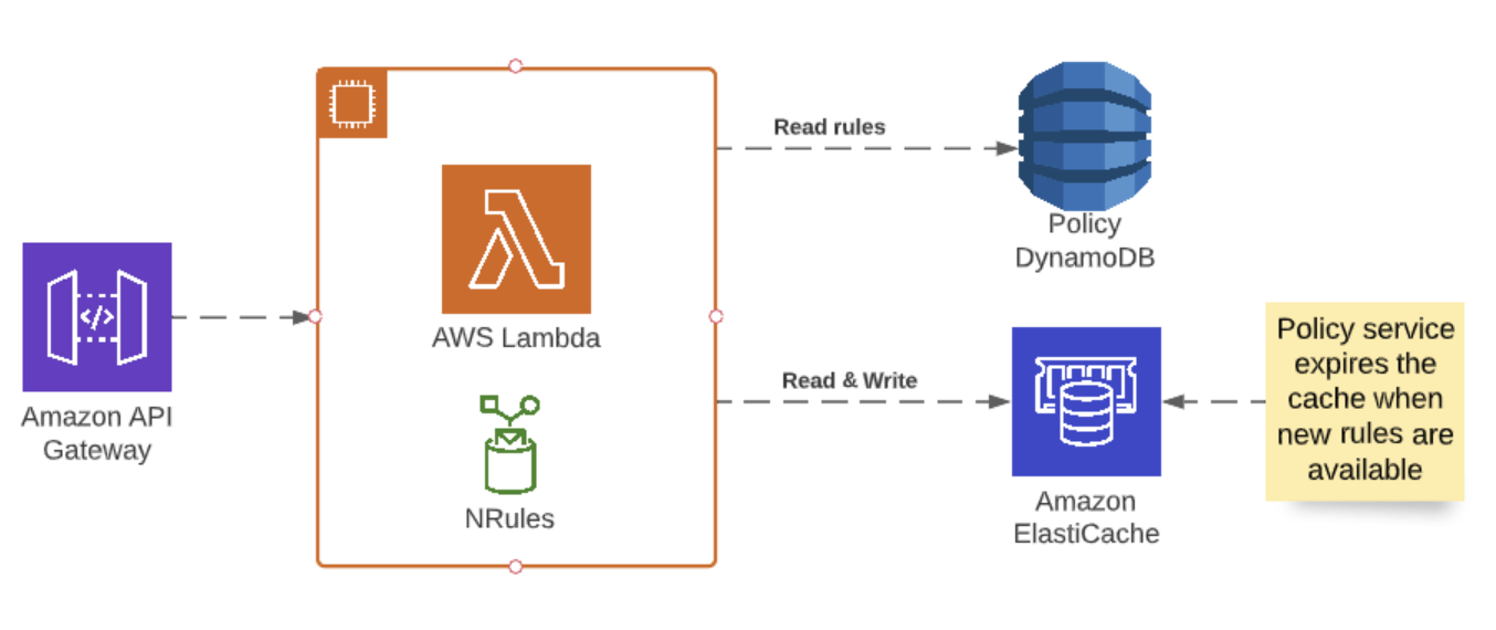 The Fenergo SaaS platform makes extensive use of AWS serverless technologies, so our natural decision was to employ AWS lambda functions to handle the Rules Engine. Lambda can scale incredibly well offering a both high performance and low cost. It is however also stateless and the AWS runtime kills the container every few minutes, making the caching more difficult. We couldn’t simply poll for SQS messages in order to reload the rules on-demand, because of the horizontal scaling. To address both issues, we introduced ElastiCache (Redis) which would store the rules. We decided to use the in-memory cache, with a short TTL to accommodate for traffic peaks from single tenants.