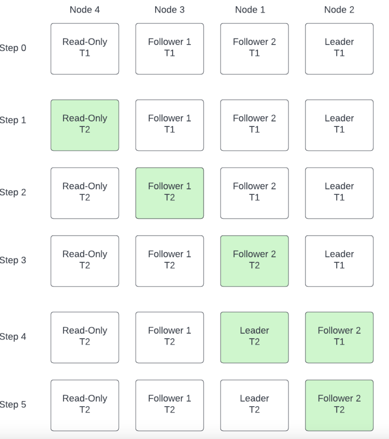 This process is described in the following diagram, where we have a cluster with four nodes, 1 Leader, 2 Followers and 1 ReadOnly, and we want to update the instance time from T1 to T2: