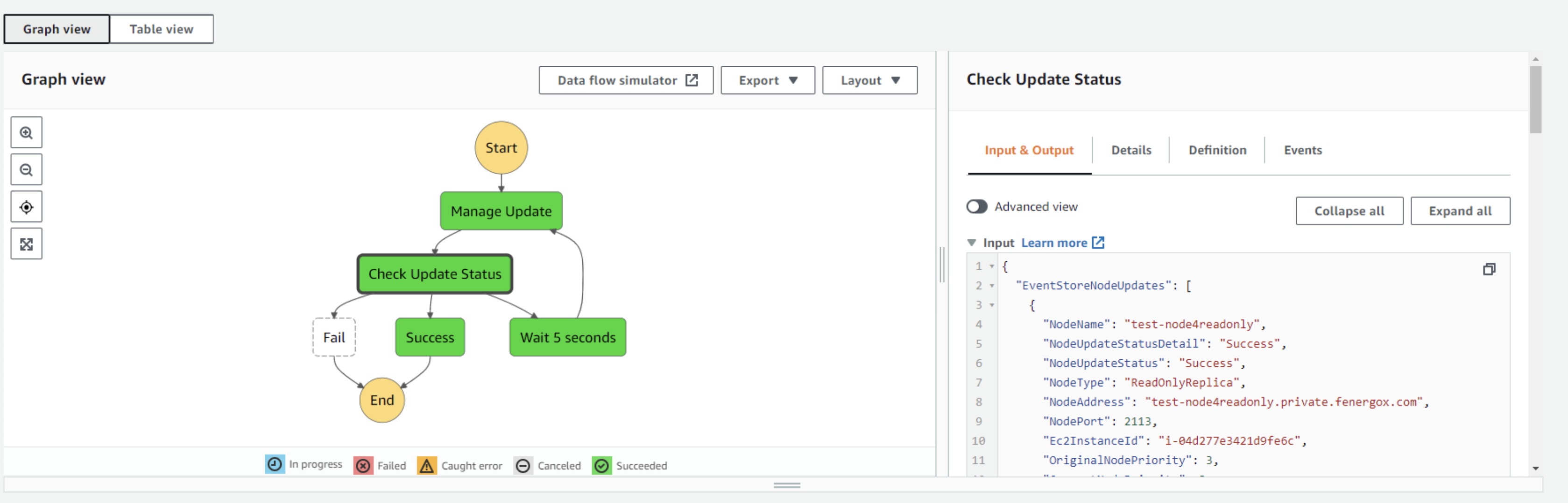 For the implementation, we have a lambda which implements a finite-state machine. The current status of the update is stored in a JSON object. This object is sent to the lambda as input. On the other hand, the lambda returns the same object as output, with the corresponding updates. In this way, we can track the status of the update and how it is making progress across every iteration. The lambda will be invoked by a step function every 5 seconds. Then, the step function will manage the long-running process, so the lambda execution time is short. This is more cost effective and prevents timeouts in the lambda, as updating all the nodes of the cluster can take some time.