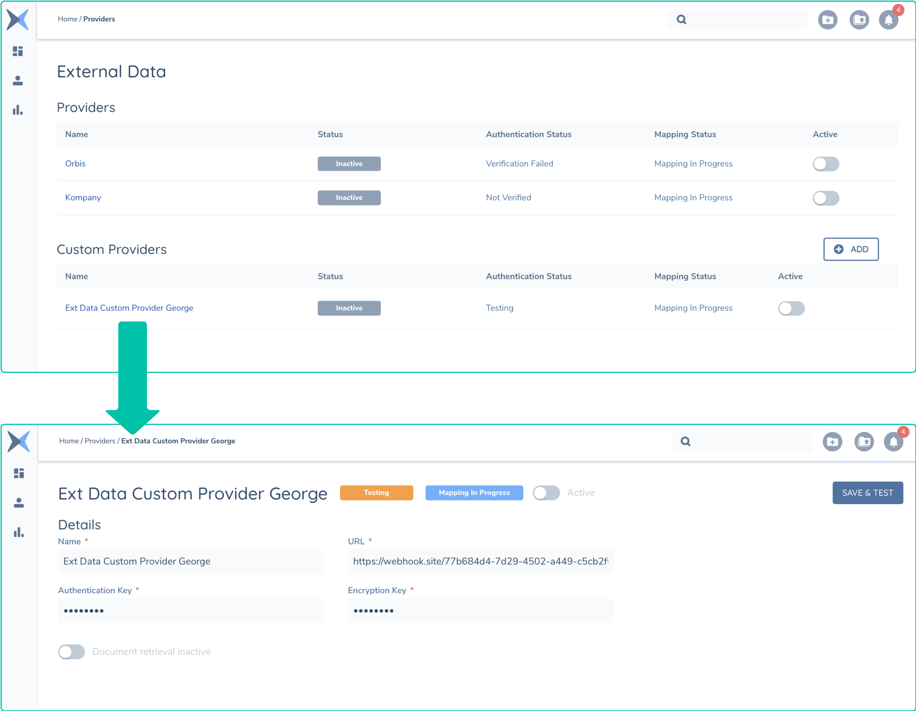 - Create Provider: The Fenergo SaaS Platform has an admin area where a new provider can be created. This will allow you to supply the URL where the adapter is located along with the Encryption and Authentication Keys required to secure the communications. Once entered, a Save and Test button will issue a Test message to the URL you have provided.