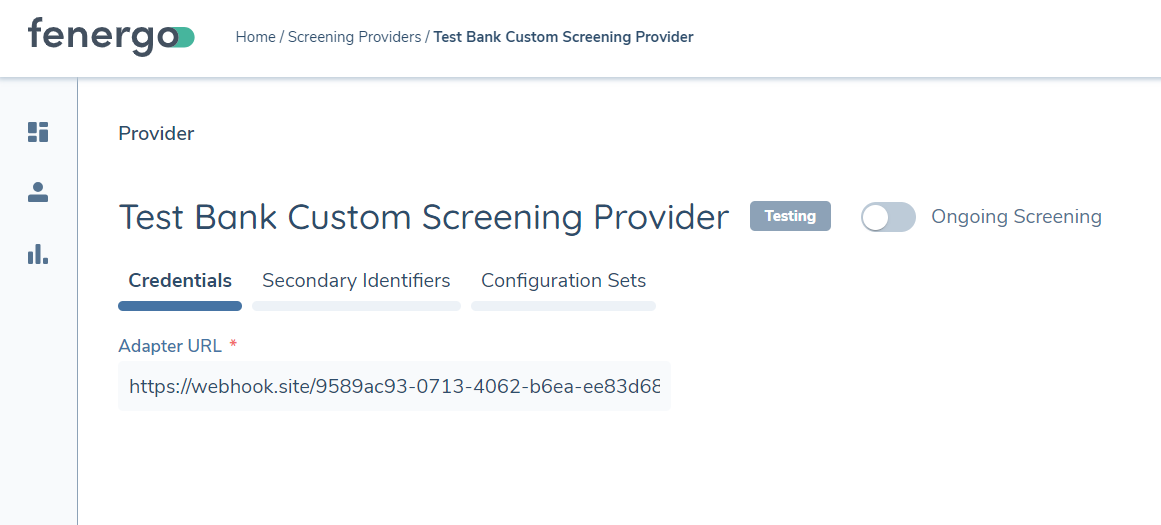 On the User interface of the Fenergo platform, if you navigate to your screening provider, you will see the status is labelled as Testing