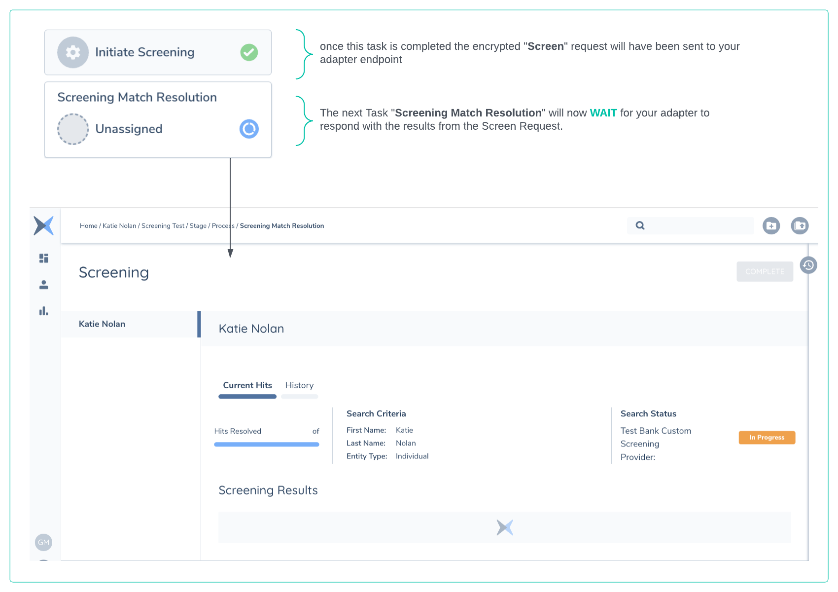 Once the above message has been sent, the task Status in the Journey is updated as below and the Screening Match Resolution task is now available. You can navigate to this task as below but you will not be able to Complete it until the results are returned and all matches resolved. The Search Status is illustrated in the User Interface and labeled with an Icon in orange as In Progress