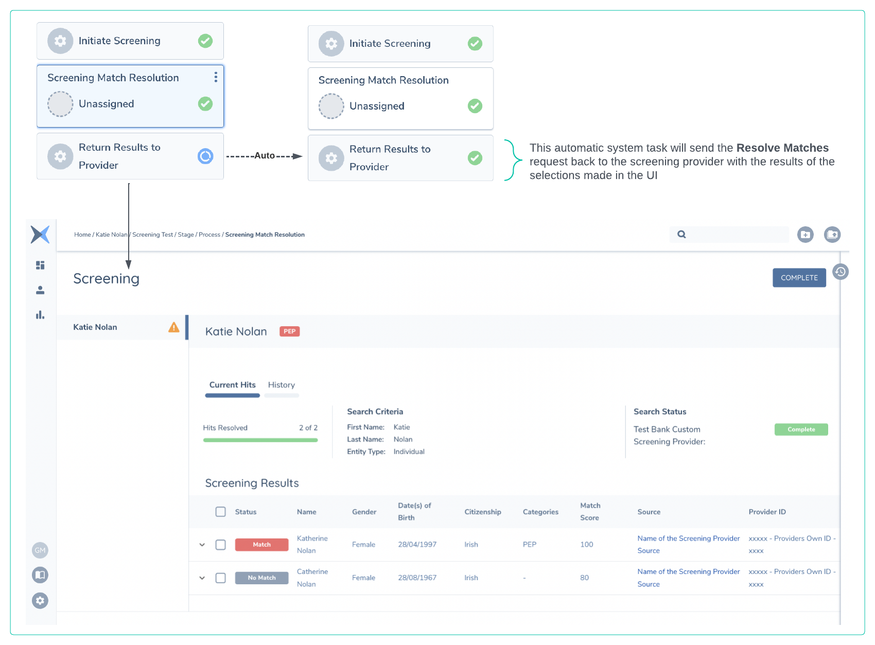 "screening:allmatchesresolved"and this will contain a link to the batch as part of the relativeUrl sent with all Event Notifications."screeningquery/api/batch/bcf3b51f-4478-4966-a9fc-21d4652ed92e" - Screening Task is Complete. The automatic task will send a Resolve Matches request to the adapter with the results of the screening activity from Fenergo.