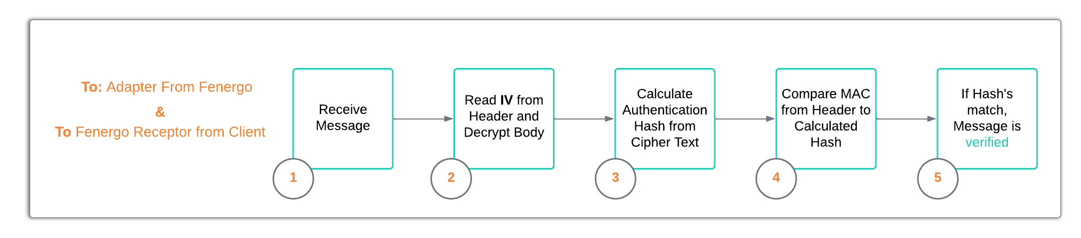 How the encryption and decryption are implemented is important to understand as Fenergo will call to a client adapter with the message body encrypted and authenticated. The client adapter must follow the Decryption Steps to read the messages and verify it originated from Fenergo. The client must then send the responses back following the same Encryption Steps. These steps are illustrated below at a high level and covered in detail within the External Adapter Encryption and Decryption Walkthrough.
