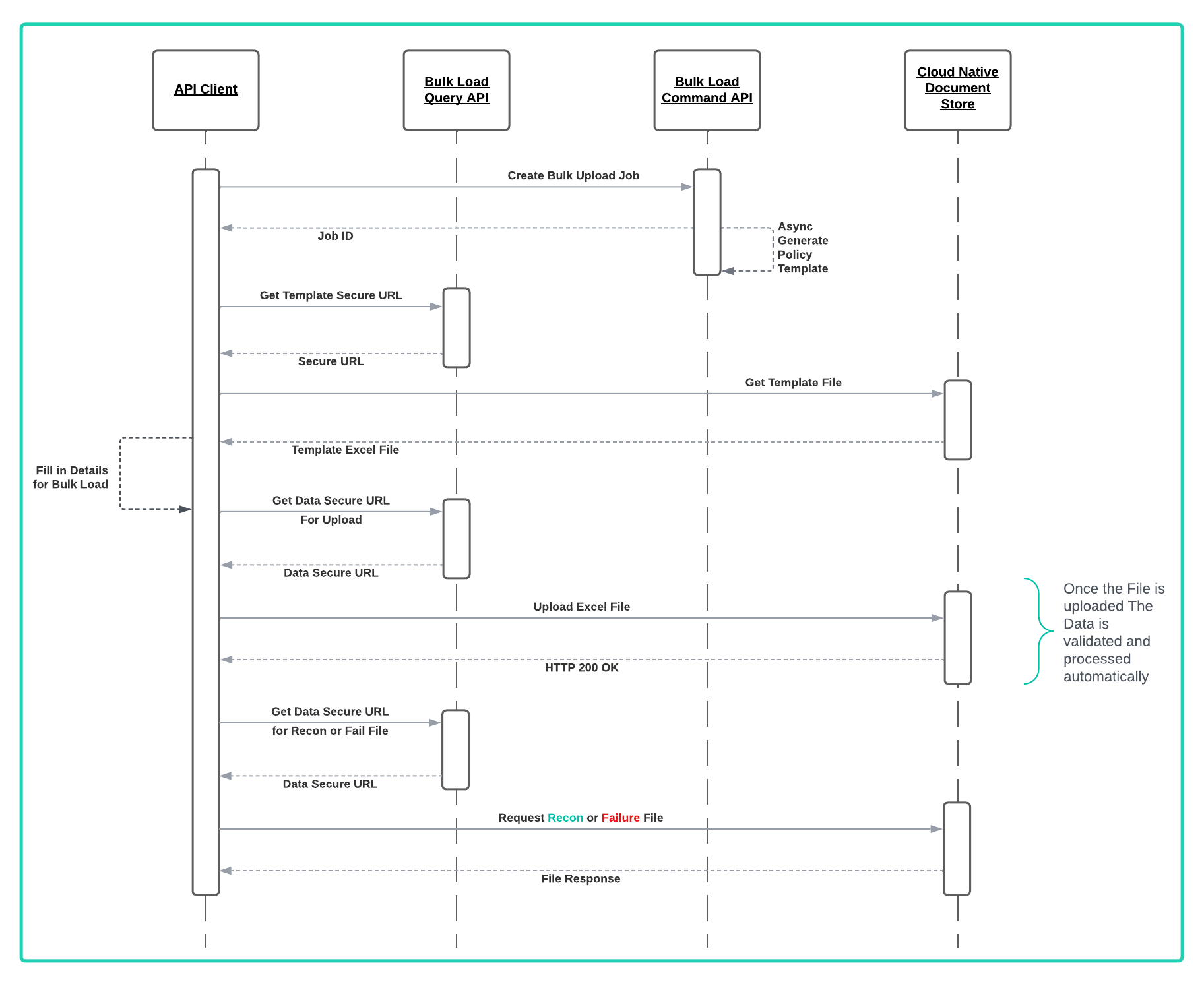 The API process for creating and initiating a bulk load job is straightforward and consists of making a number of API calls to create and execute the job. The steps are outlined below and illustrated in the sequence diagram.