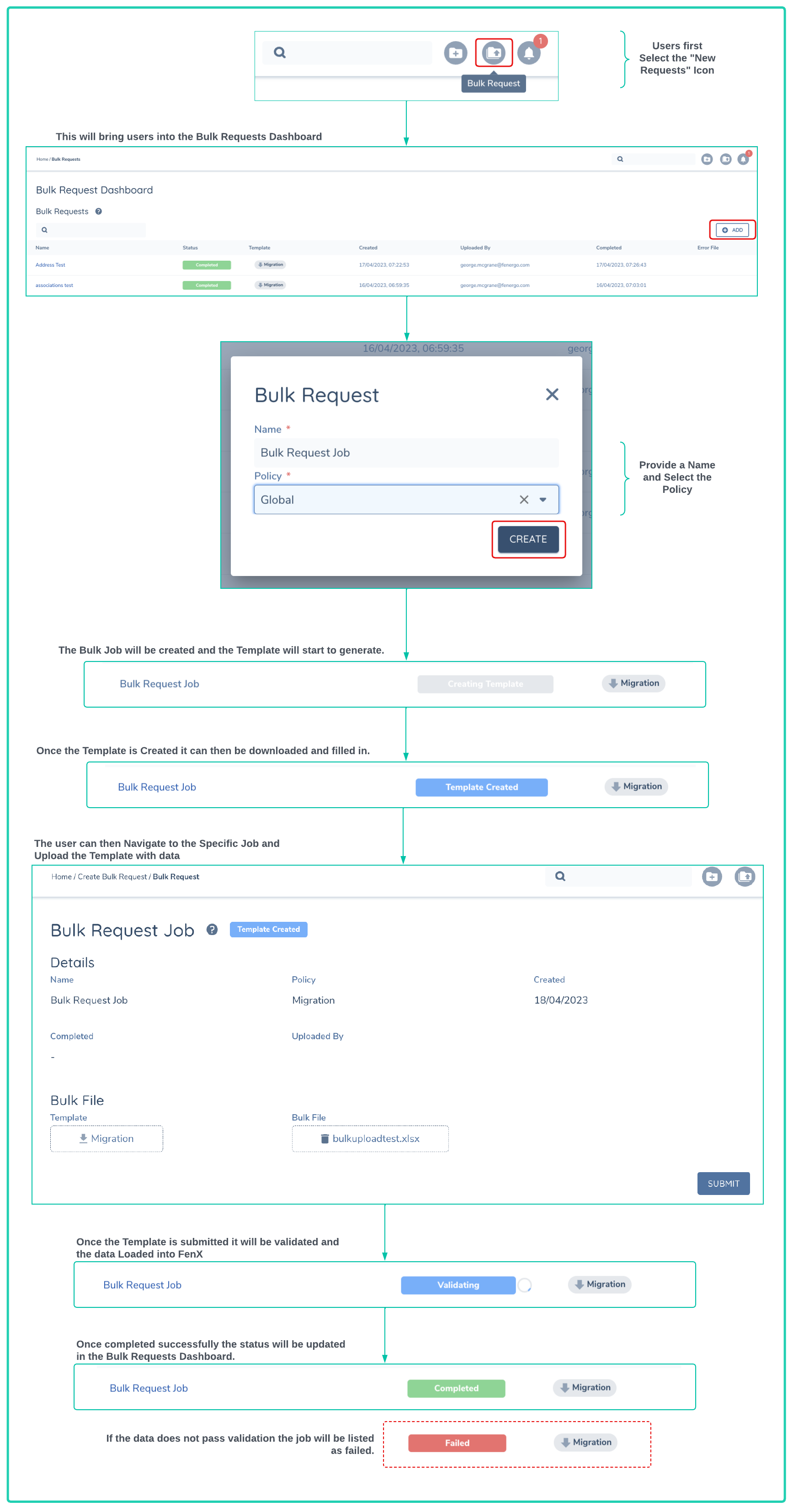 - Select the Bulk Request Icon: This will bring you to the Bulk request Dashboard. The dashboard will list all the outstanding, completed and failed Bulk Requests (including those created via the API).