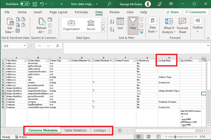 • Lookups The "Lookup Name" column (H) in the Metadata Tab identifies the lookup which is referenced. The valid values for all the lookups needed in the Migration are listed in this tab.