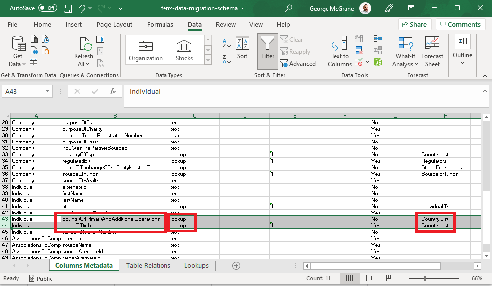 The Individual CSV has columns called countryOfPrimaryAndAdditionalOperations and placeOfBirth. Valid values have been added to the sample CSV above, these valid values came from the Lookups Tab in the "Schema" file, It indicated which lookup type needs to be used to populate the column. Clients may need to transform their data to these values before they migrate.