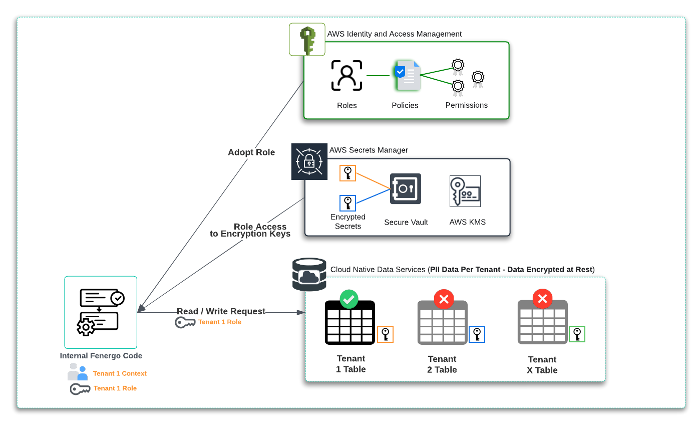 When code is requesting access to the DynamoDB Service, it must assume a role which has permission to access that data resource (for DynamoDB a table). The underlying data encrypted with a unique Tenant Encryption Key. This key can be Fenergo or Client Managed but is unique to the tenant and permission to access the key is tied to the tenant role. As illustrated below, the cloud native code component has AWS IAM and Secrets Manager Integration enabled as a feature of the service, so from a development / implementation perspective, requesting and adopting the role, then requesting and using the encryption key, are abstracted from the implementation as part of the Service offering. This results in a cleaner code implementation which is easier to manage and ensure that no poor practices such as embedding static configurations into code occurs.