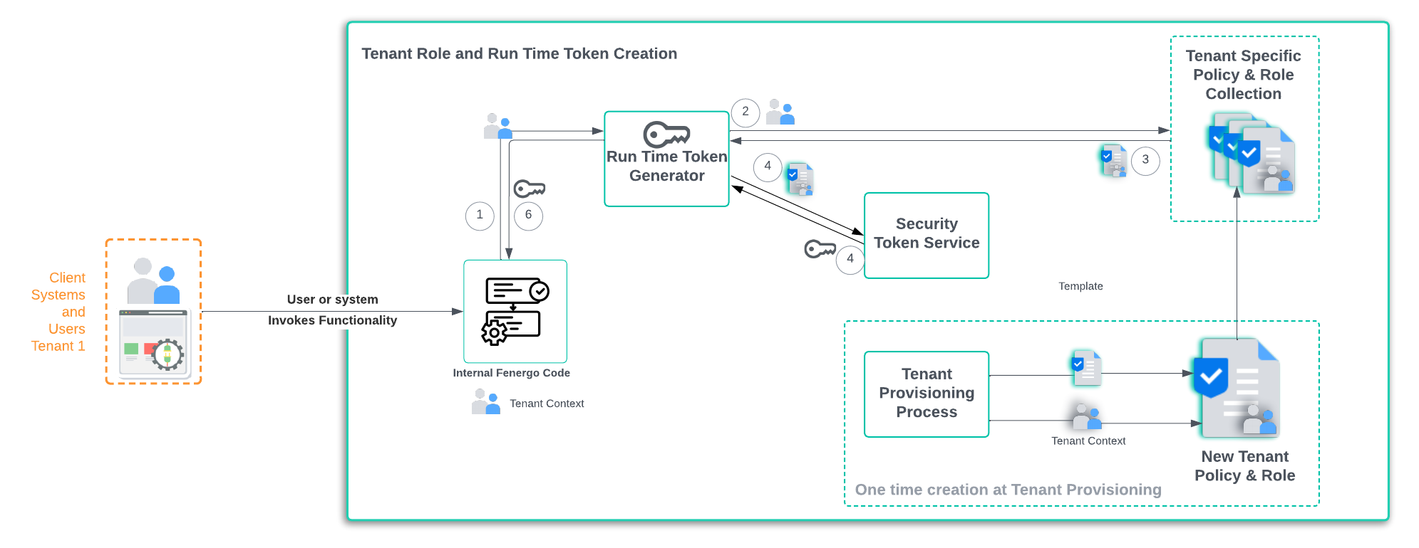 Tenant Roles are created at the same time a Tenant is provisioned, and all required permissions are tied to only that tenants specific resources. It is common best practice for SaaS vendors to create and implement an Isolation Strategy for their solutions because especially cloud native and microservice architectures are comprised of a lot more separate moving parts compared to a traditional monolithic platform. The Runtime Role Adoption pattern allows fenergo to dynamically select tenant specific policies at run time. Post Authentication, once a tenant has been identified, the illustration below outlines how a combination of Up Front Provisioning and Run Time Selection based on tenant context, is used to select the right Role and generate an Access Token.