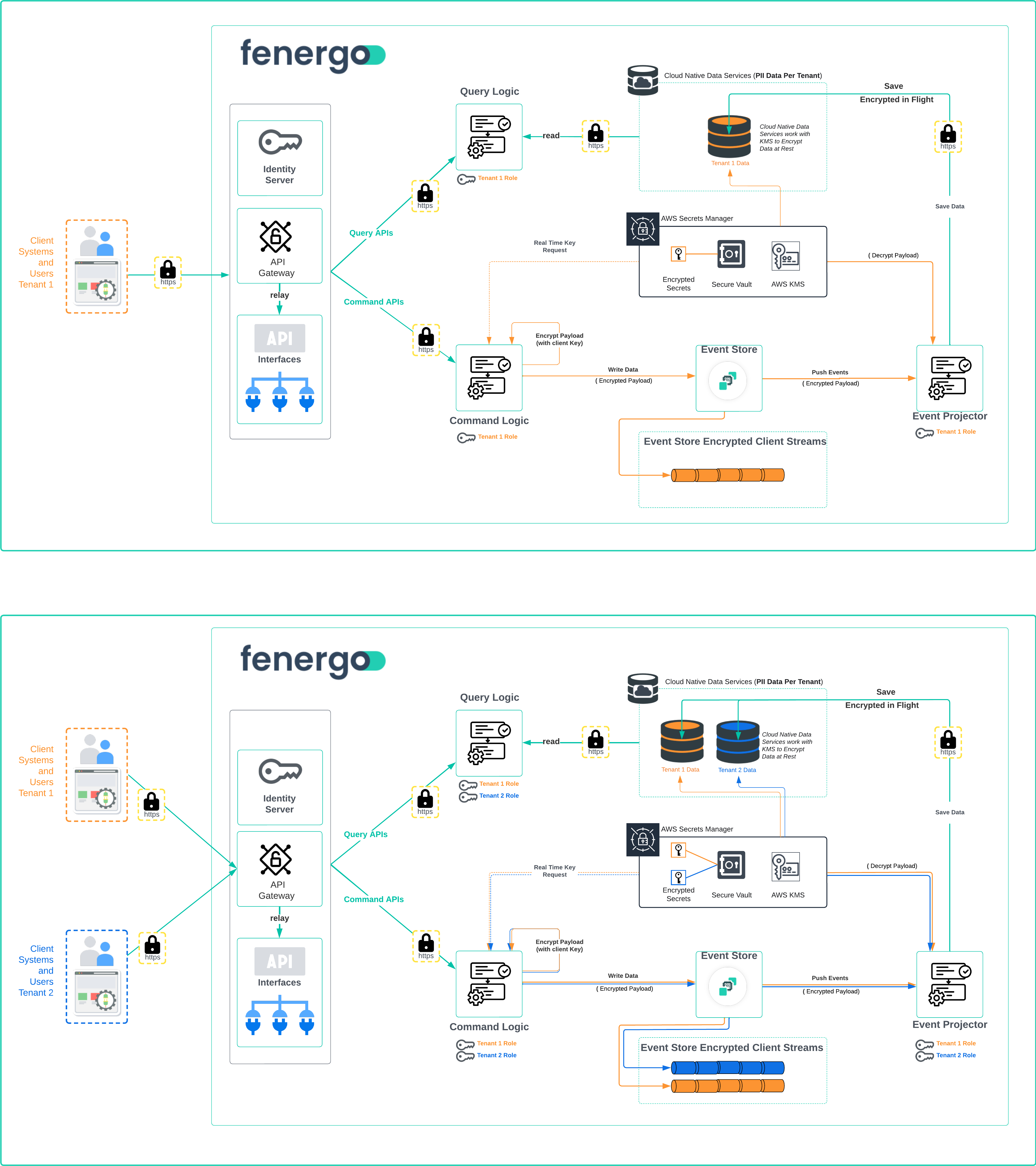 Not all components of the Fenergo SaaS platform use cloud native compute. We have employed the Event Sourcing Pattern, which stores data in an Append Only log. All Command API calls create new or change existing data (commits). Those calls come from numerous tenants for a given Fenergo SaaS deployment and that data is added to a dedicated client stream within the event store In Order of Arrival. These streams are not made up of structured data but data events. Those data events are then Projected to other domains within the platform and processed to achieve a business outcome. Once saved in the client stream, the data is projected to other units of business logic and saved to data store (cloud native as described above) to support Query API Read operations. Queries do not run against the event store. To learn more about event sourcing see Introduction to Event Sourcing Non Cloud Native services such as our Event Sourcing solution which is a commercial product, require a specific tactic to ensure tenant isolation within the client streams of the Append Only log. This is illustrated in the diagrams below covering what it looks like from a Single Tenant Perspective and then a Multi-Tenant View. The meta data of each incoming data event does not need to be encrypted (All data is encrypted in flight using HTTPS / TLS ) but as the log actually data at rest, the payloads of the messages submitted are encrypted using clients specific keys. Those keys are store in KMS and retrieved from AWS Secrets Manager when required.
