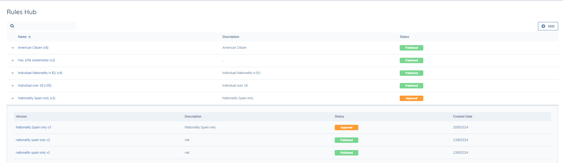 The list of rules is searchable, each rule will have a name, description and status. Collapsing a rule will show all the versions of the rule and the date the version was created. Each version can be evaluated.