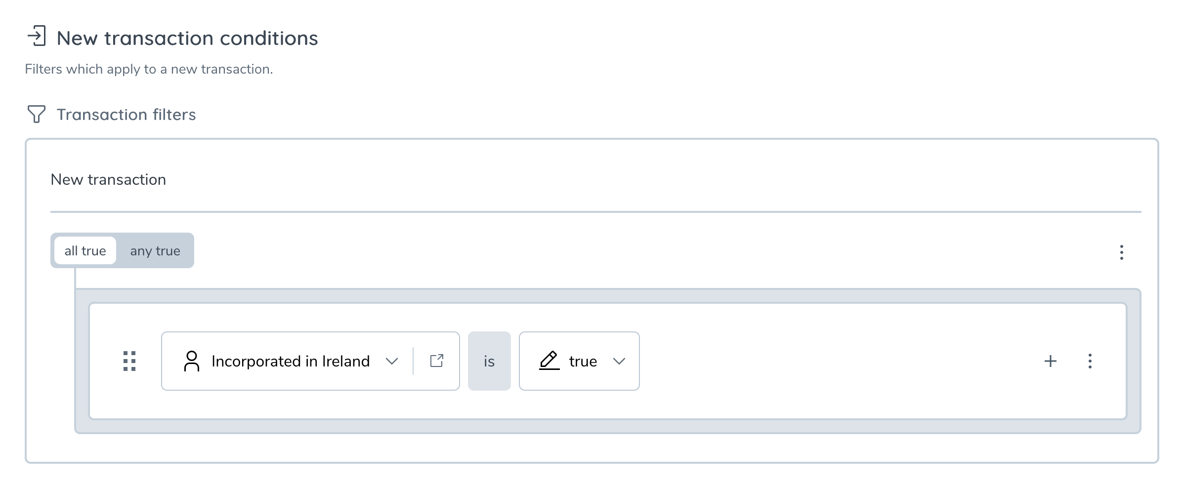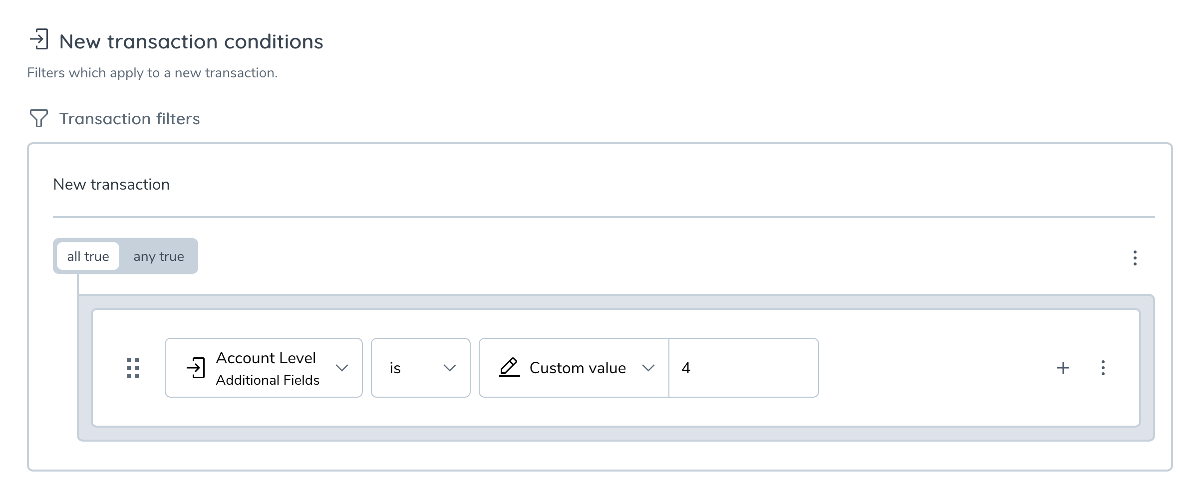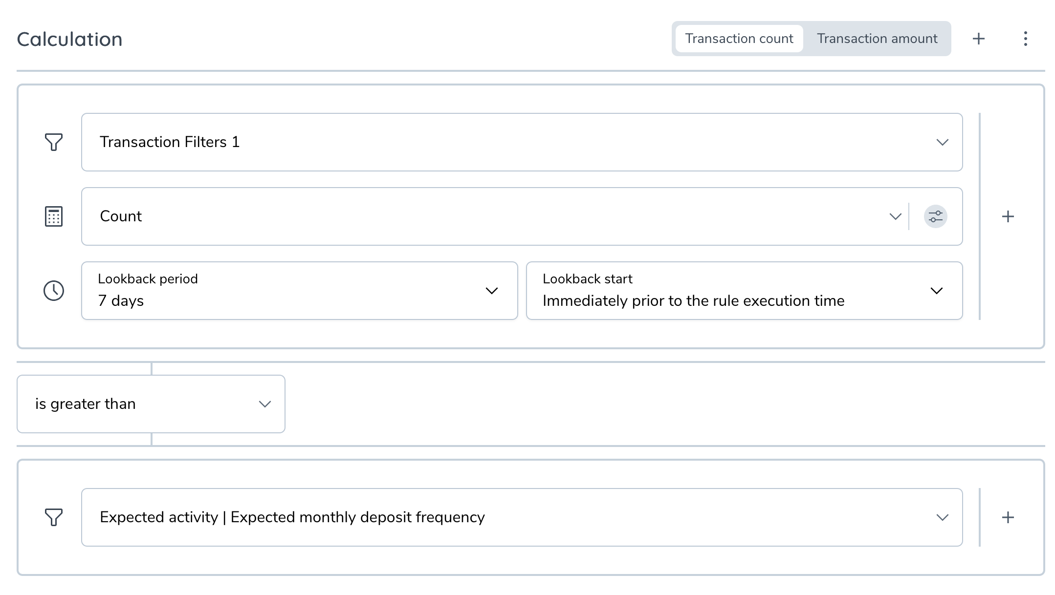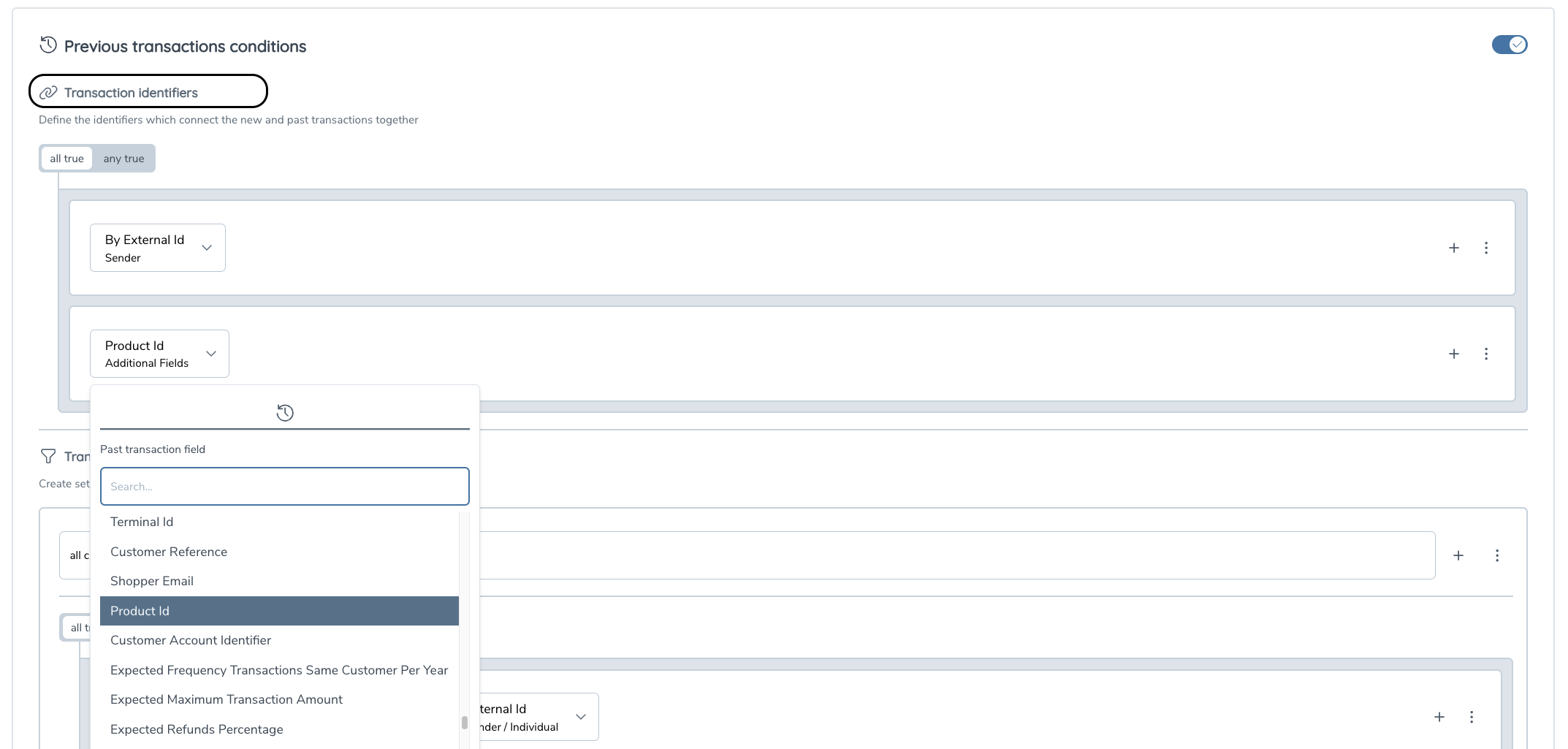 From the rule builder perspective, additional fields are treated similarly as the basic transaction and entity fields. This means that you can select them as left and/or right-hand operands in new transaction filters, as well as in transaction filters that are apart of the past transaction conditions.