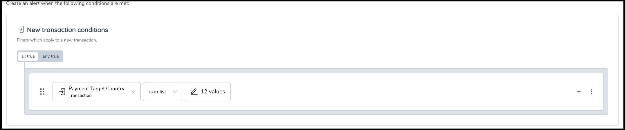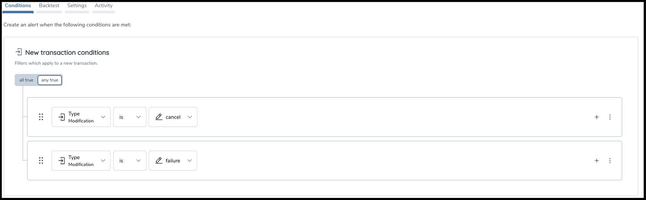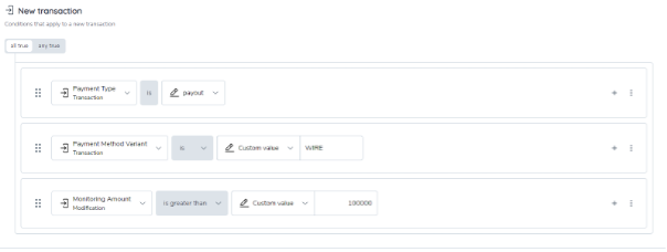 The any true combination requires that any condition individually needs to be true for the group condition to be true. The example below identifies any transaction with a Payment Method Variant of "TXN-TYPE-100" or "TXN-TYPE-200".