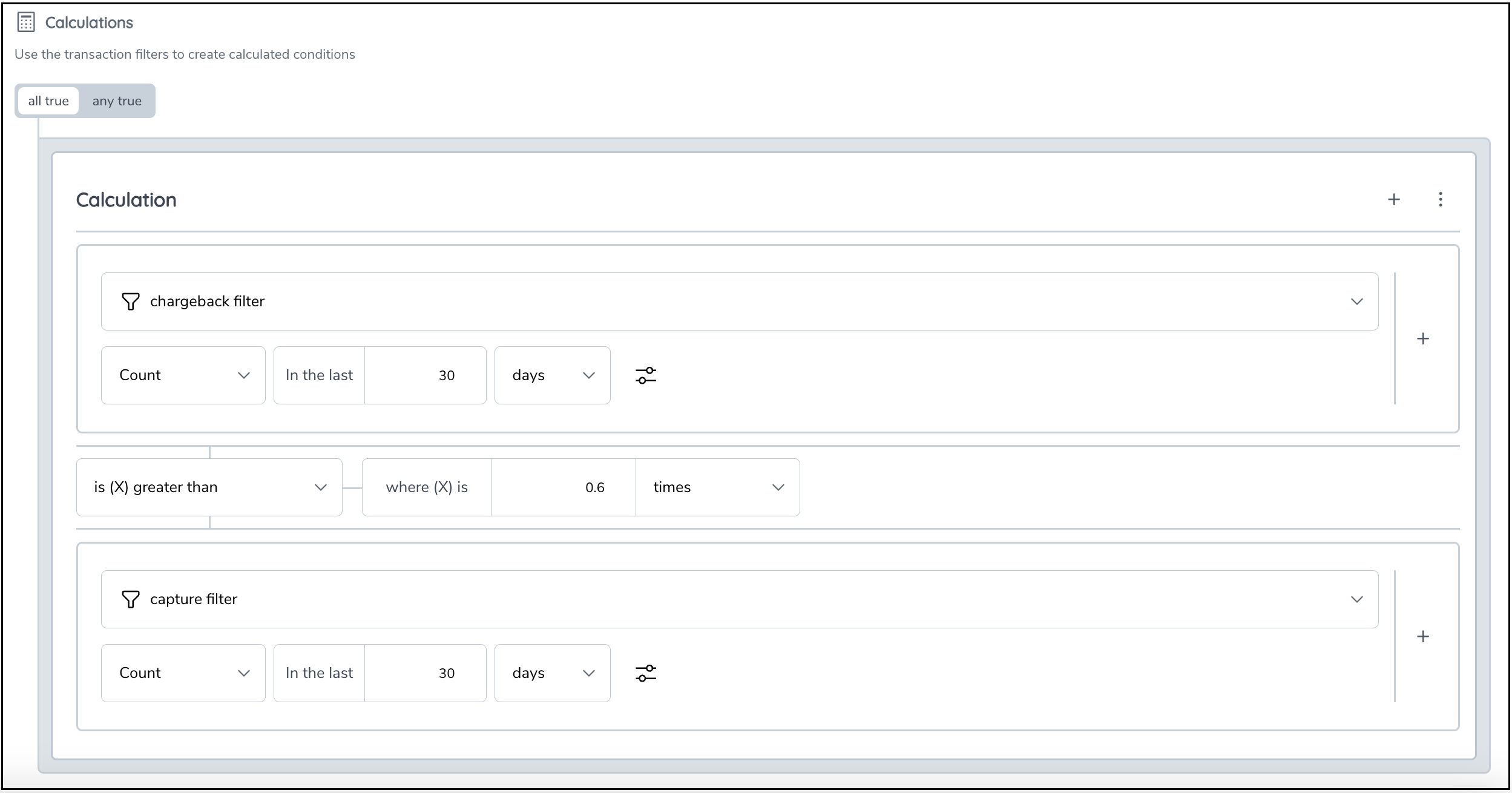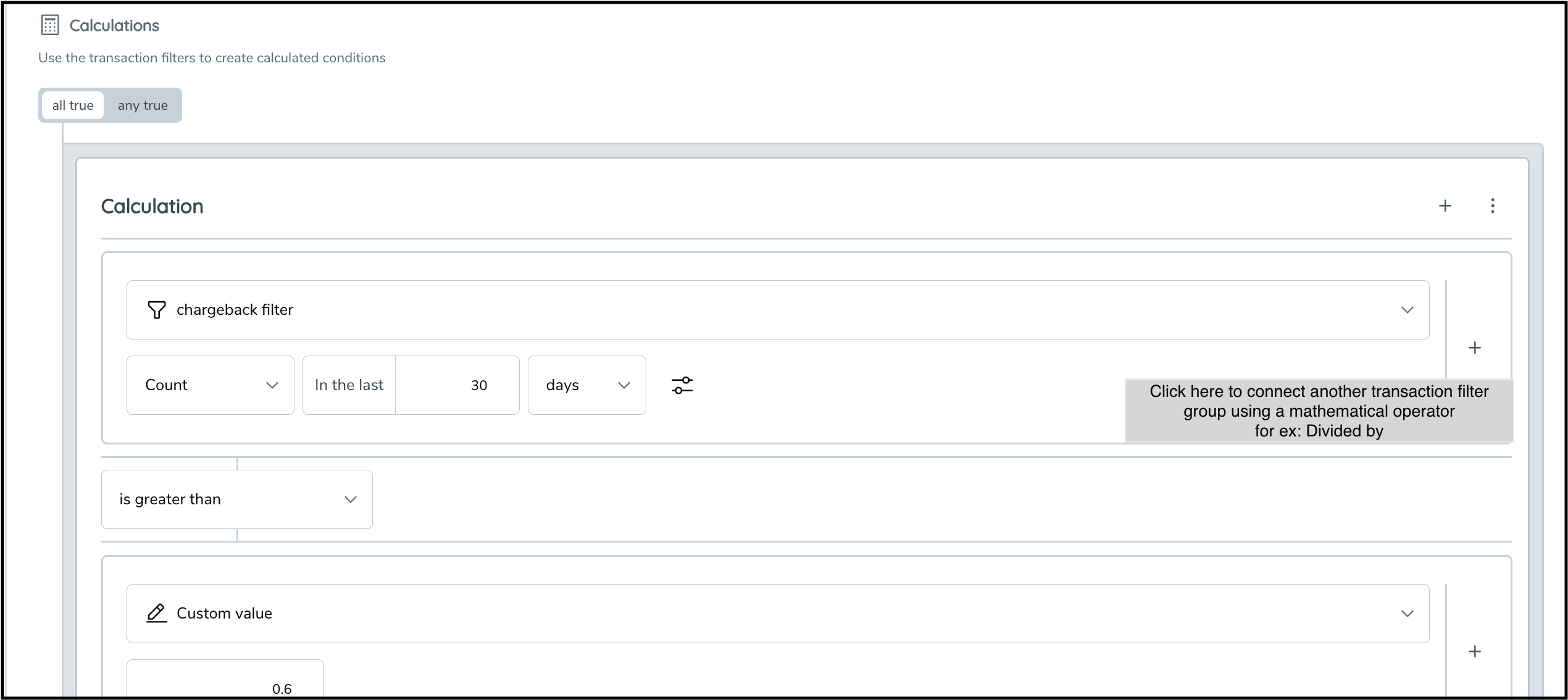 Transactions to High-Risk Countries is 3 times greater than All Captured Transactions. - Example 3: To check if the disputes-to-sales ratio is more than 0.6, express the rule as