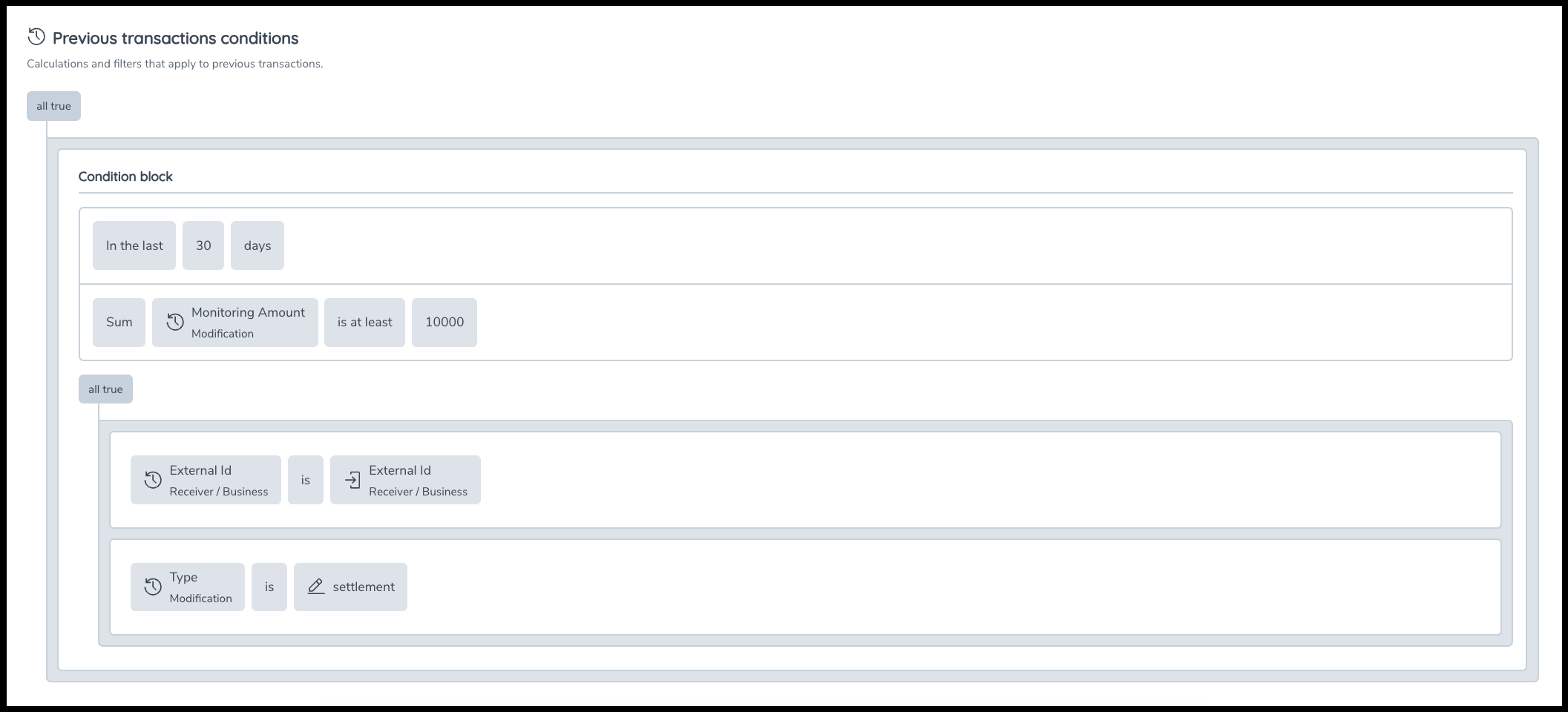 Finally, we must identify a way to connect the new transaction to the historic transactions. Typically, this is done using entity ID. In this case, we connect the new transaction to the historic transactions by stating the receiver's ID in the previous transactions [![] (RackMultipart20231206-1-8pzv8n_html_9375fca8e1d2a183.png) ] is the same as the sender's ID in the new transaction [![] (RackMultipart20231206-1-8pzv8n_html_471545d078ed95c9.png) ]. This would mean this alert would only flag if the same entity previously received transactions that met the conditions in both the previous transactions sections (several inbound transactions) and new transaction section (one outbound transaction).