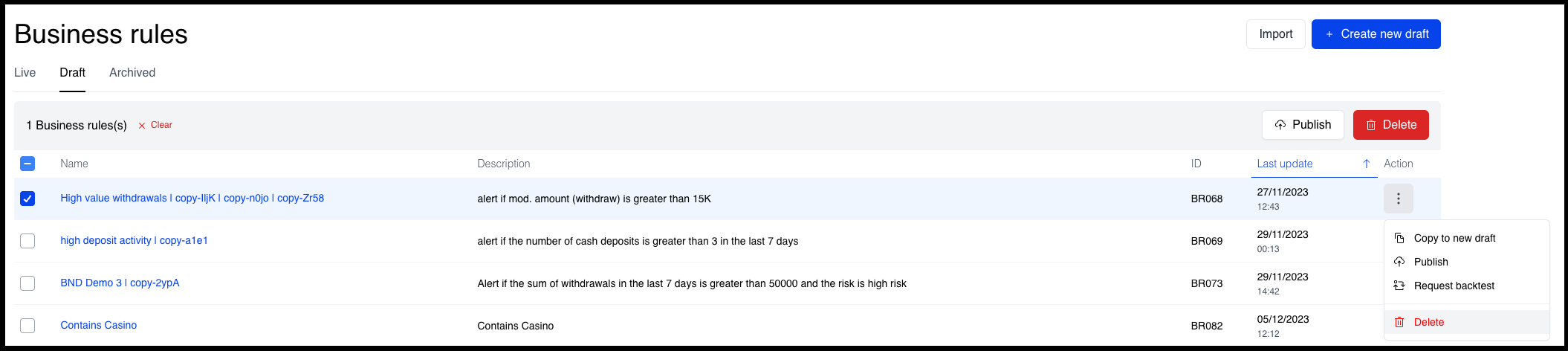 Rules are managed through a lifecycle by performing Actions on the rule moving it from Draft to Live to Archive.