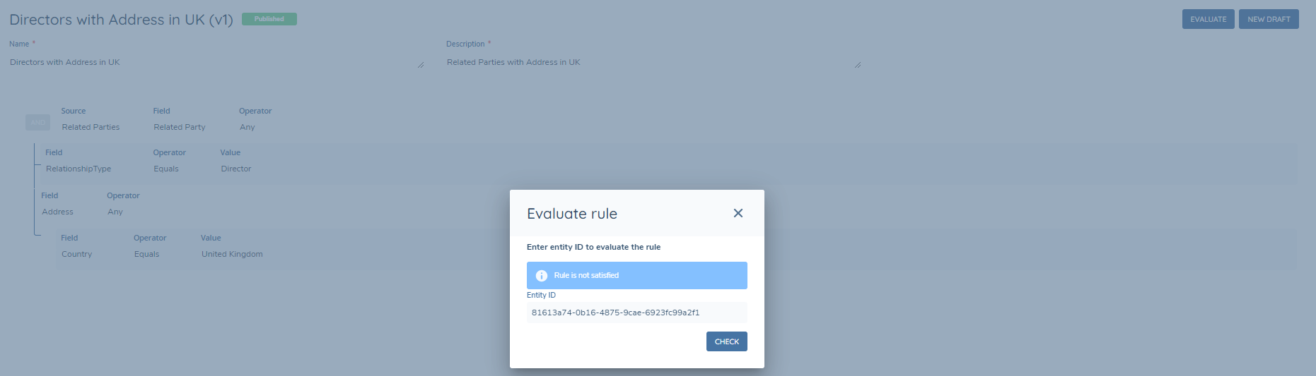 Once a rule is approved, users will see an Evaluate button, clicking on this will invoke a modal which will run the rule on an entity. Enter the entity id on the modal and it will indicate if the rule is satisfied for this entity or not.