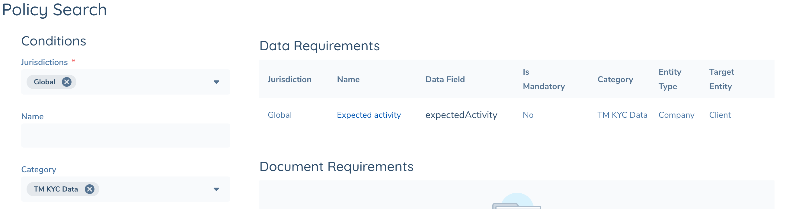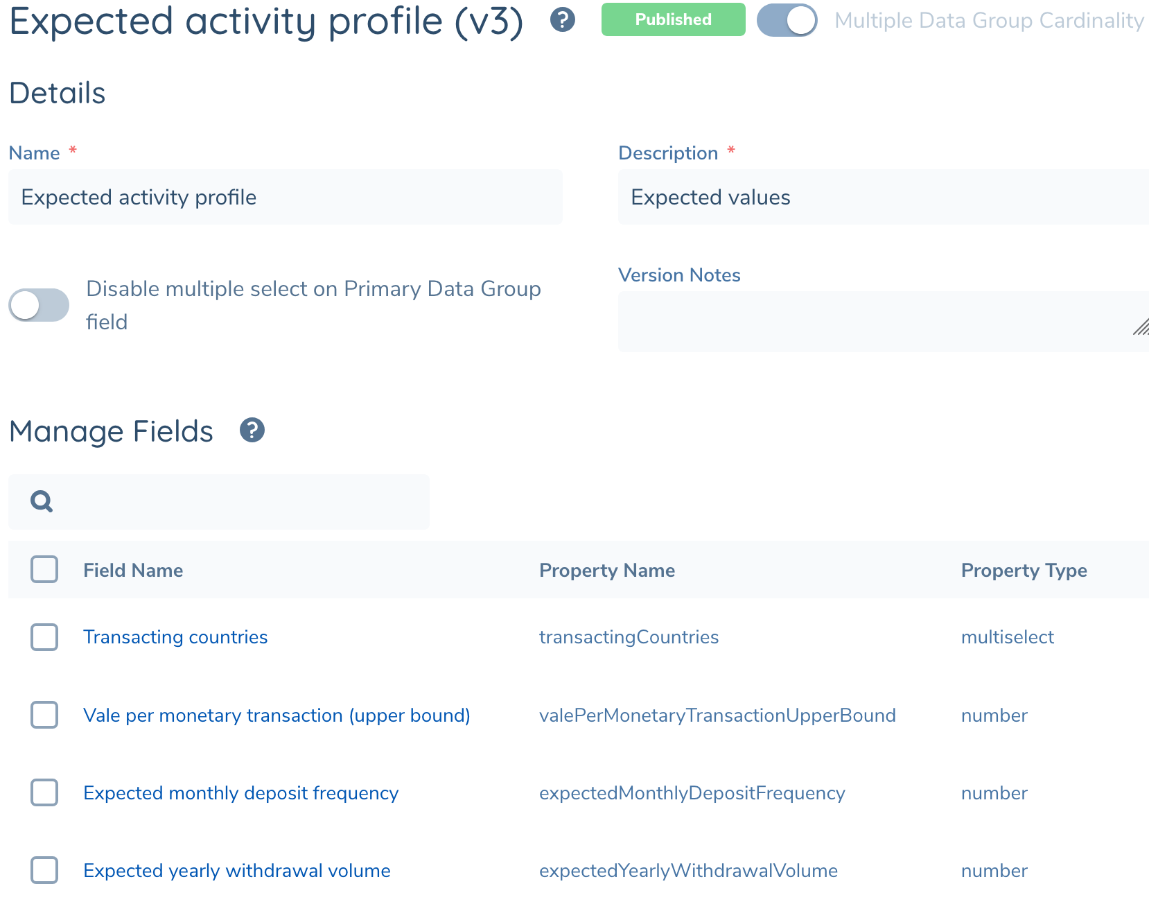 - TM KYC Data fields: fields that are part of data groups linked to the TM KYC Data category