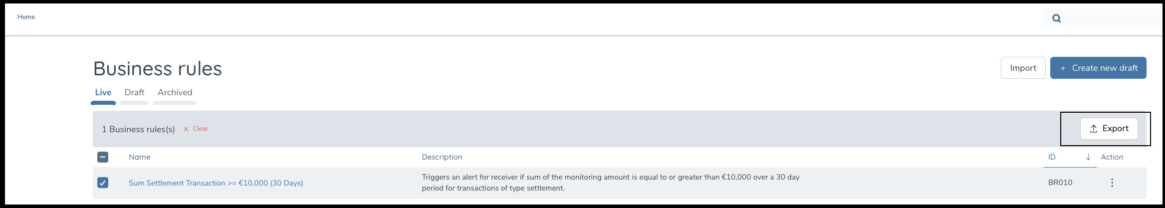 Authorised Users can export 'Live' business rules built out from one tenant and import them into another tenant as a draft rule. This feature exists to simplify the process of setting up the business rules manager with previously tried and tested rules from another environment (For example: UAT).