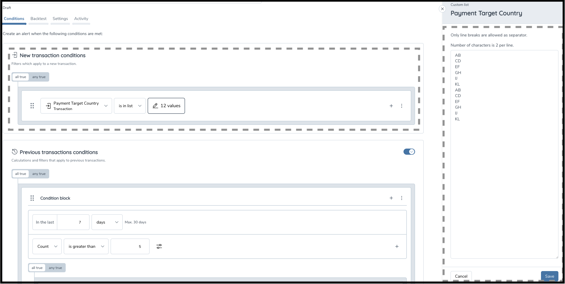 - Example 1: To check if transactions to high-risk countries are 25% of all transactions in the last 30 days, express the rule as