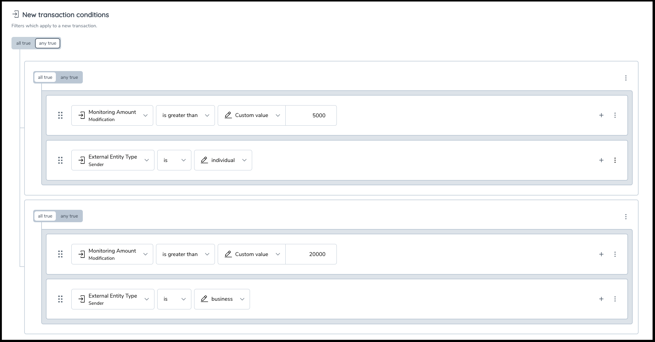 You can create complex rules with up to two nested levels of logic by creating a condition group within another group. The example below identifies transactions for high-risk entities with a value over 50,000 or transactions for medium-risk entities with transaction value over 100,000. You can add multiple levels of nested levels as needed.