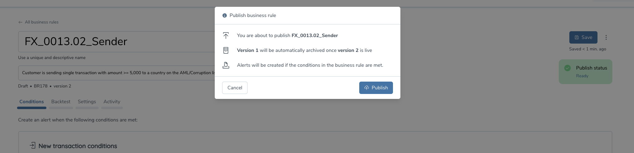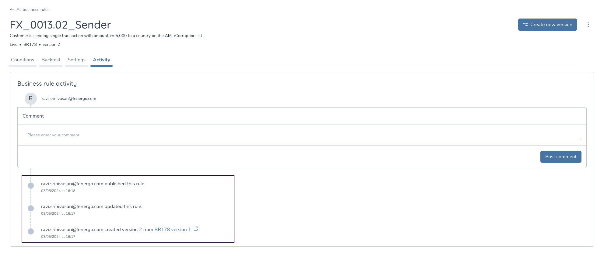 There is a clear lineage established between versions of the same rule to facilitate internal audits. The activity trail of each rule will indicate any links to a previous version.