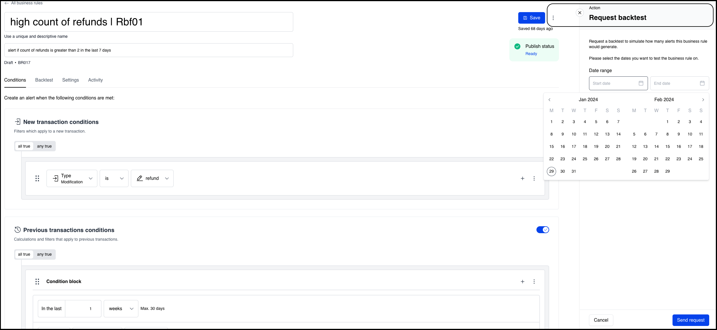 To launch the backtesting service, click the Action button on the rule details screen. Specify the from-to date range over which to run the backtest and click Send Request.