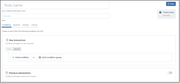 You can create a new rule from the Rule Manager home page by clicking on the Create New Draft button which brings you to the Rule Details page. You can save a partly configured rule and return to complete it later.
