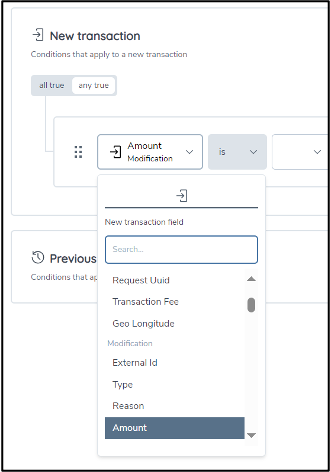When editing a rule, you can use any of the available transaction attributes to implement a detection scenario. These fields are presented in a drop-down list. If you have chosen to map additional custom fields in the API, these will also be available to you.