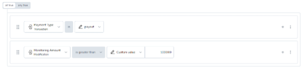 You can combine expressions into a group, denominated by an outline on the user interface, containing all the conditions belonging to that group within its borders. The all true combination requires that each condition must be true for the group condition to evaluate to true. The example below depicts a condition group which identifies any payment greater than 100,000 where the payment type is payout.