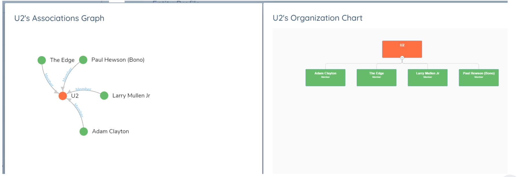In the Example below a Simple "Root Legal Entity" representing the band U2 can be seen with relationships to the four band members. These are known as Inbound relationships and can verbalized as "The Edge is a 25% Member of U2".