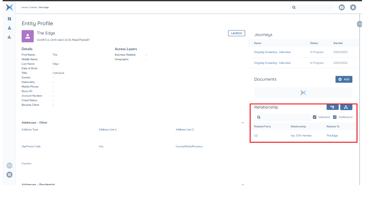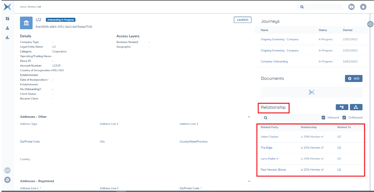This relationship also exists in the Opposite direction and navigating to the related Party, the relationship is described as an "Outbound" relationship and can be verbalized as "U2 has a 25% Member called The Edge".