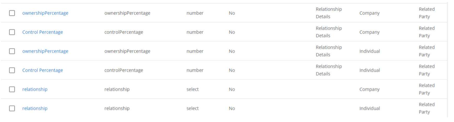 - ownershipPercentage - Category: Relationship Details | Target Entity: Related Party | Data Type: Number