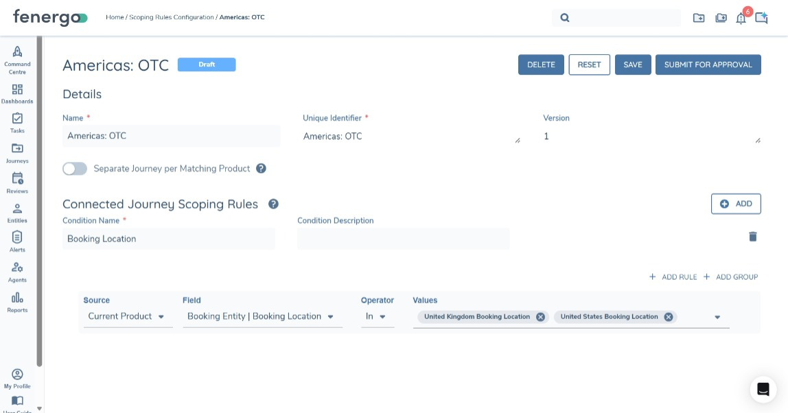 'Connected Journey' Product Scoping rules are used to determine which of a Journeys product drafts qualify for a Product Connected Journey. They are called for evaluation by the 'Product Journey Launchpad' task. One or multiple products can match to a Product Scoping Rule, depending on how tightly they are configured - i.e. depending on how specific the conditions are. For example, if I wanted to group all UK products together, I may configure a Product Scoping rule with a 'Booking Entity' condition only. However, if I wanted to separate journeys for UK products by Product Family and or Product Type, I could do that too.