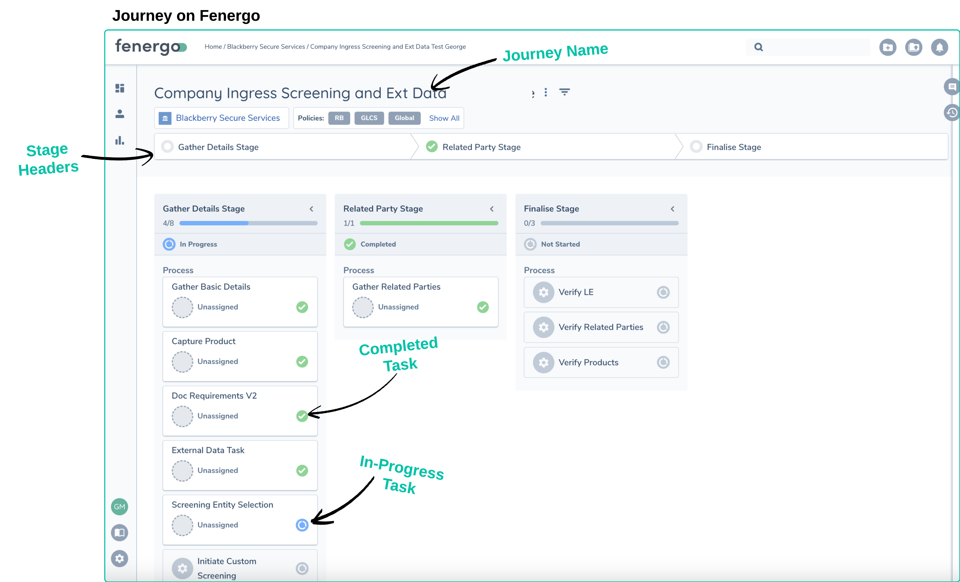 - In Fenergo, Journeys are made up of Processes, which contain Stages, which in turn contain Tasks.