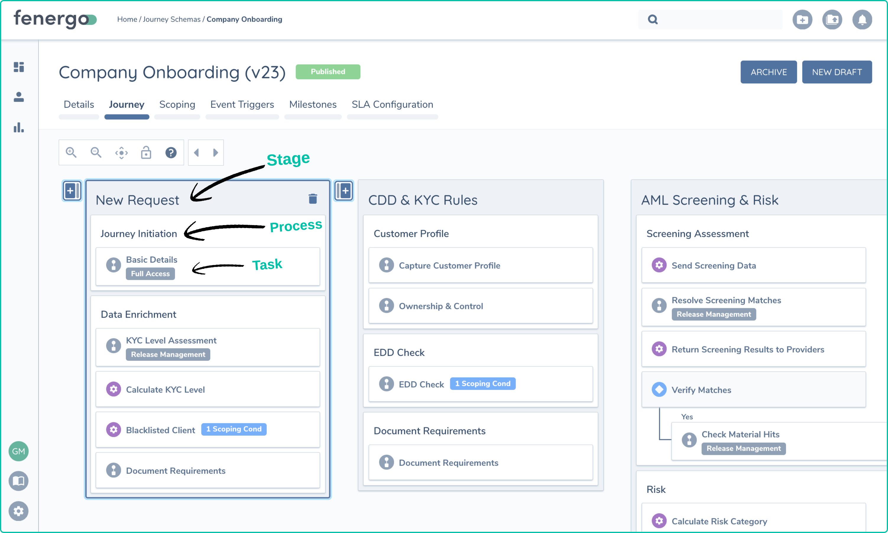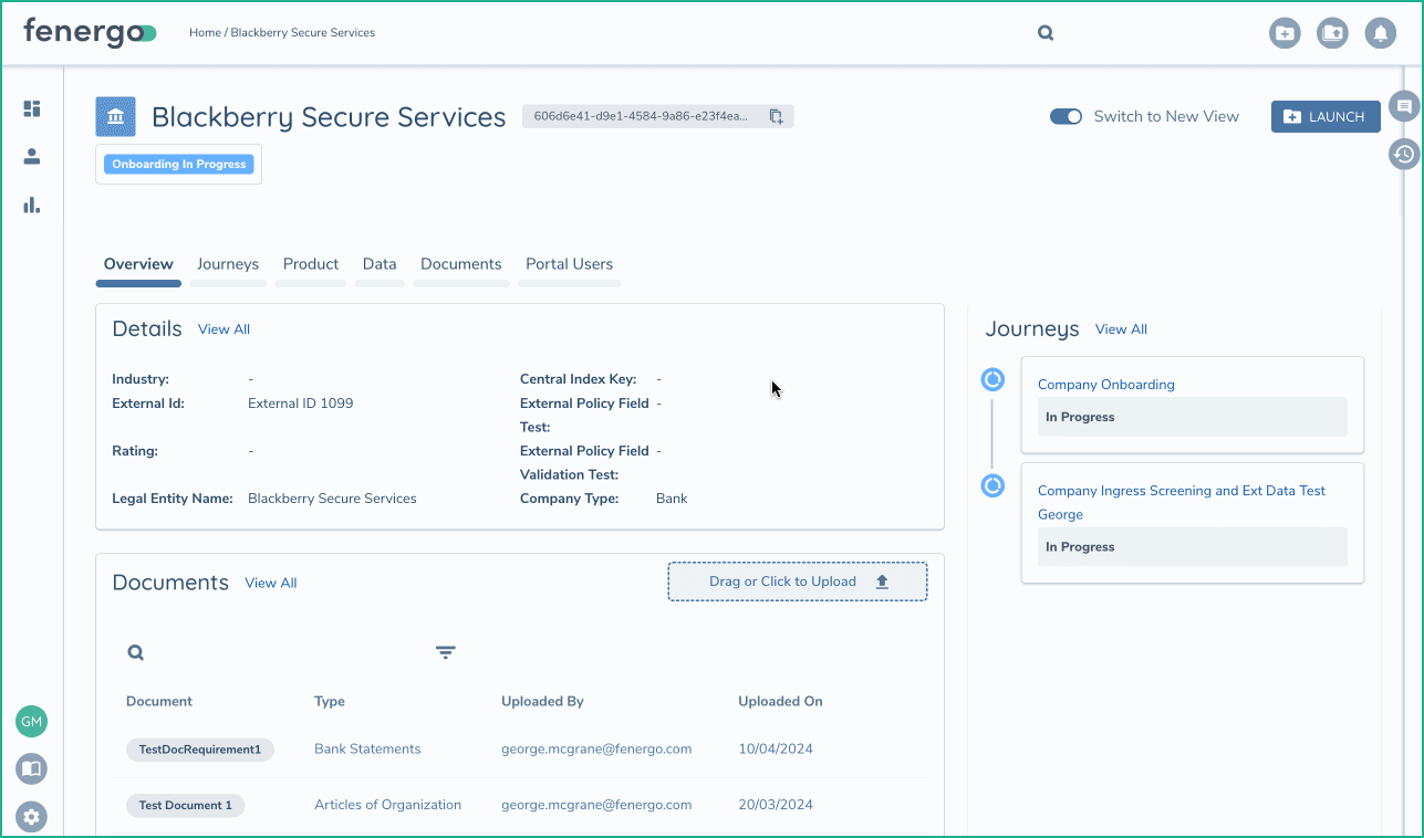 As discussed previously, the Journey construct on Fenergo's SaaS platform is where clients really get to working with data and ensuring that data is correct and meeting the high bar of regulatory compliance that Financial Institutions must meet.